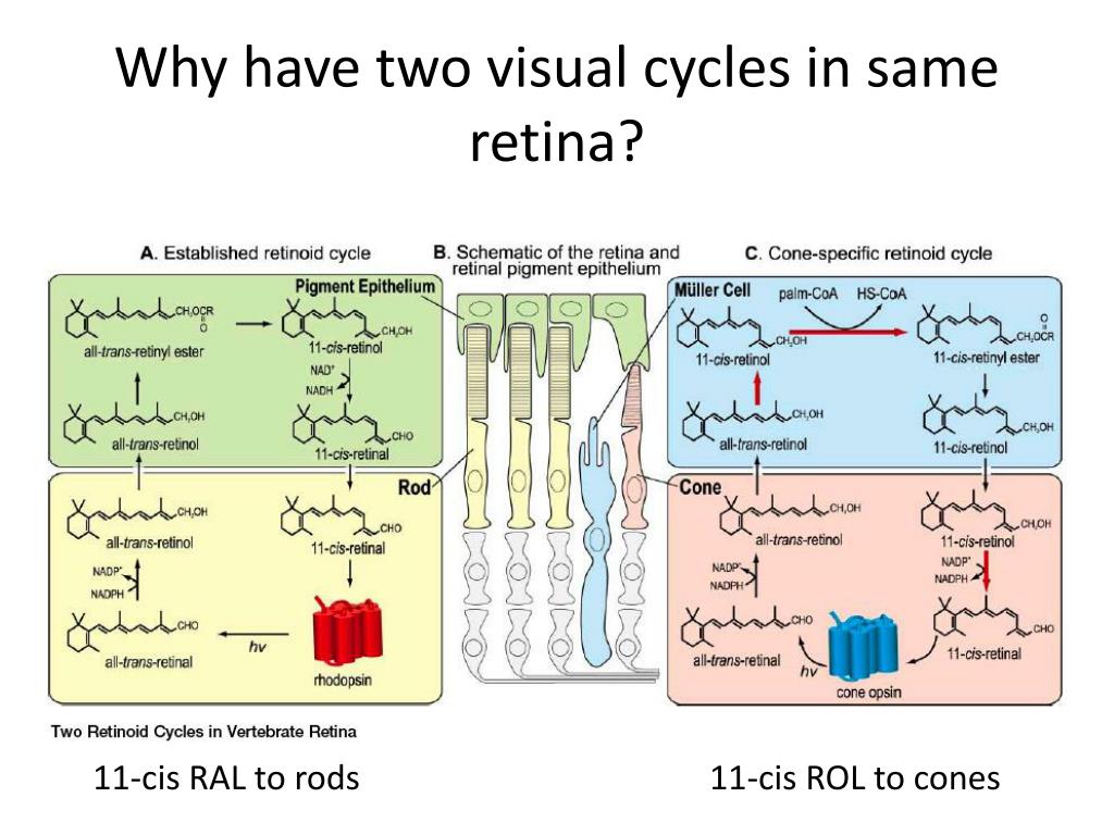 Why have two visual cycles in same retina? 11-cis RAL to rods 11-cis ROL to cones