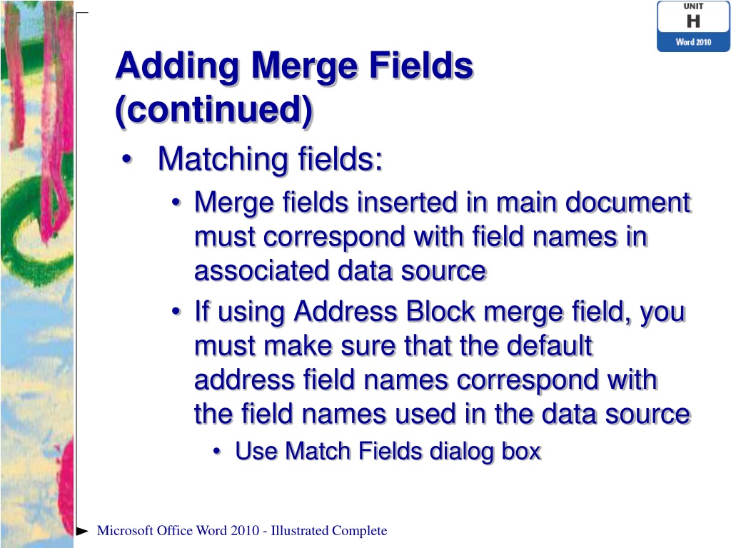 Adding Merge Fields (continued) • Matching fields: • Merge fields inserted in main document must correspond with field names in associated data source • If using Address Block merge field, you must make sure that the default address field names correspond with the field names used in the data source • Use Match Fields dialog box Microsoft Office Word 2010 - Illustrated Complete