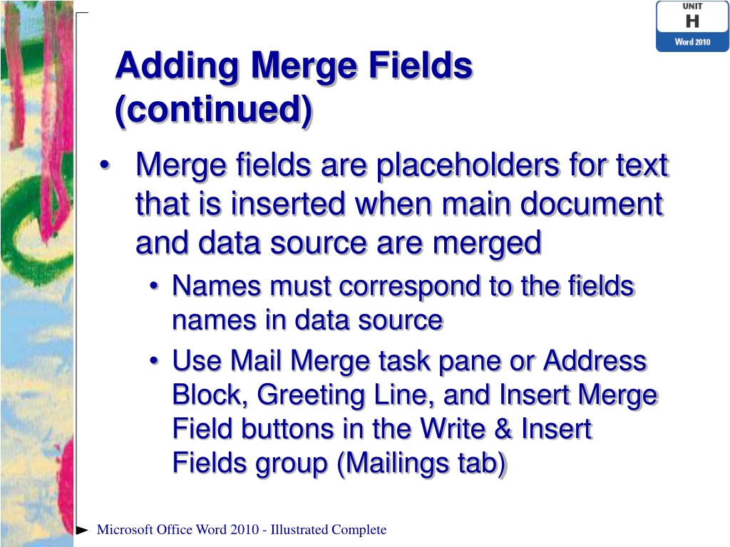 Adding Merge Fields (continued) • Merge fields are placeholders for text that is inserted when main document and data source are merged • Names must correspond to the fields names in data source • Use Mail Merge task pane or Address Block, Greeting Line, and Insert Merge Field buttons in the Write & Insert Fields group (Mailings tab) Microsoft Office Word 2010 - Illustrated Complete