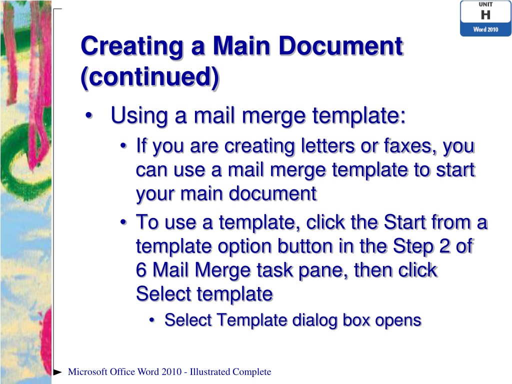 Creating a Main Document (continued) • Step 2: Select starting document (the main document) • Create from scratch • Save an existing document as a main document • Use a mail merge template Microsoft Office Word 2010 - Illustrated Complete