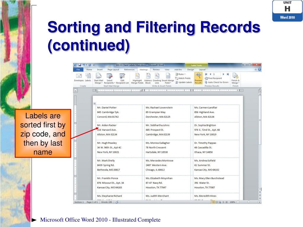 Sorting and Filtering Records (continued) Labels are sorted first by zip code, and then by last name Microsoft Office Word 2010 - Illustrated Complete