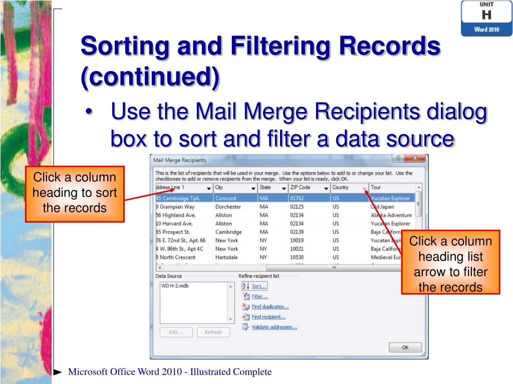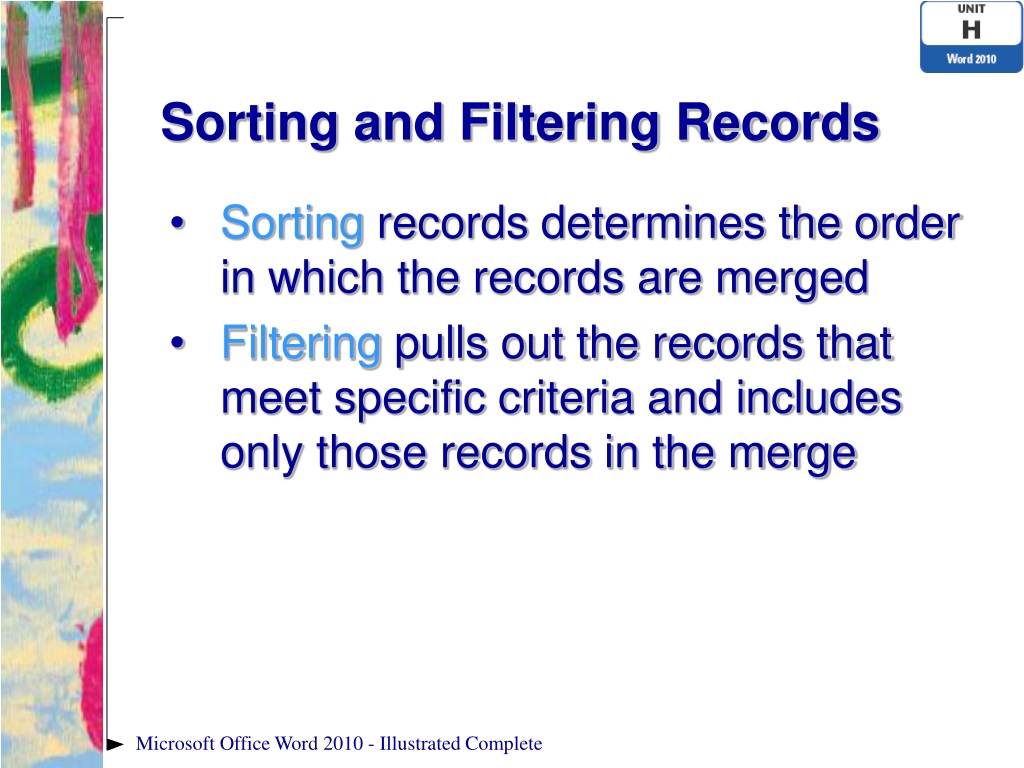 Sorting and Filtering Records • Sorting records determines the order in which the records are merged • Filtering pulls out the records that meet specific criteria and includes only those records in the merge Microsoft Office Word 2010 - Illustrated Complete
