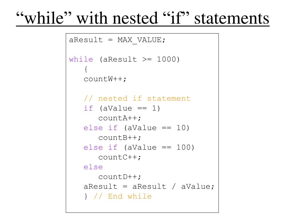 “while” with nested “if” statements aResult = MAX_VALUE; while (aResult >= 1000) { countW++;// nested if statementif (aValue == 1) countA++;elseif (aValue == 10) countB++;elseif (aValue == 100) countC++;else countD++; aResult = aResult / aValue; } // End while