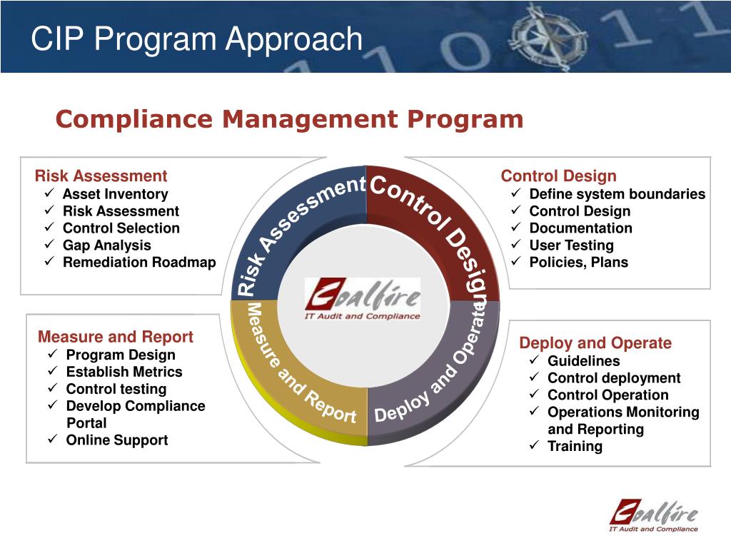 CIP Program Approach Risk Assessment • Asset Inventory • Risk Assessment • Control Selection • Gap Analysis • Remediation Roadmap Control Design • Define system boundaries • Control Design • Documentation • User Testing • Policies, Plans Risk Assessment Control Design Deploy and Operate Measure and Report Measure and Report • Program Design • Establish Metrics • Control testing • Develop Compliance Portal • Online Support Deploy and Operate • Guidelines • Control deployment • Control Operation • Operations Monitoring and Reporting • Training Compliance Management Program