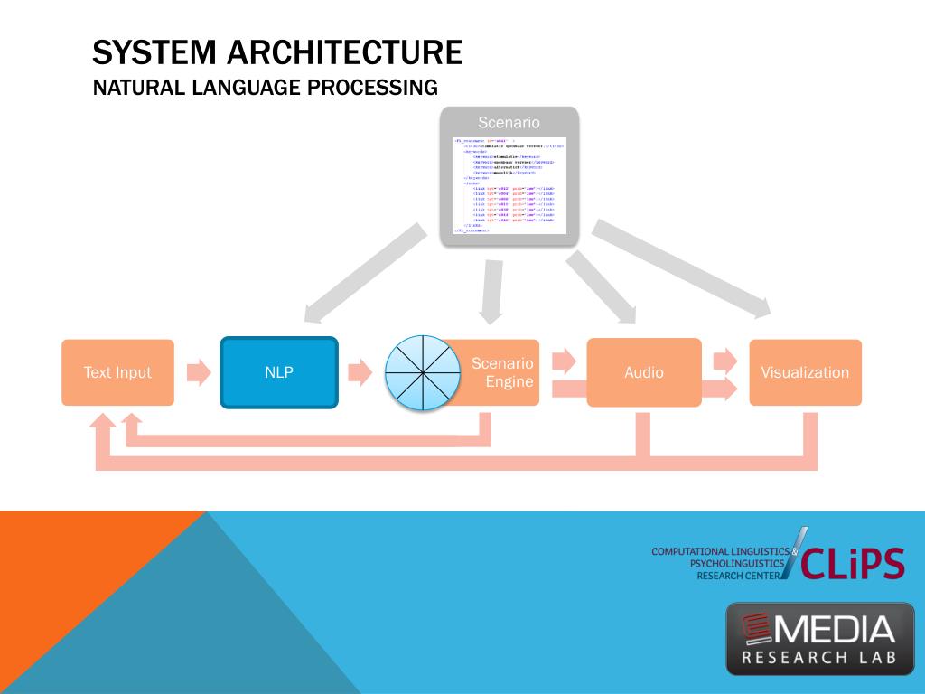 System Architecturenaturallanguage processing • Scenario • Text Input • NLP • ScenarioEngine • Audio • Visualization