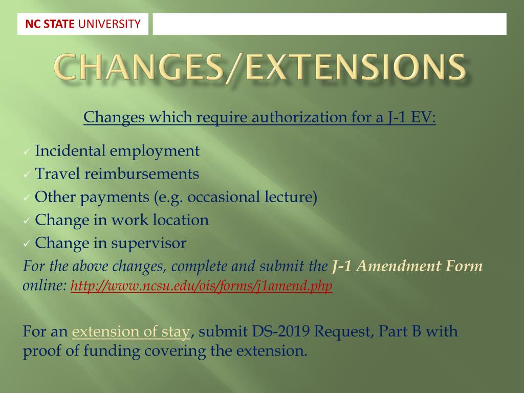 NC STATE UNIVERSITY Changes/extensions Changes which require authorization for a J-1 EV: Incidental employment Travel reimbursements Other payments (e.g. occasional lecture) Change in work location Change in supervisor For the above changes, complete and submit the J-1 Amendment Form online: http://www.ncsu.edu/ois/forms/j1amend.php For an extension of stay, submit DS-2019 Request, Part B with proof of funding covering the extension.