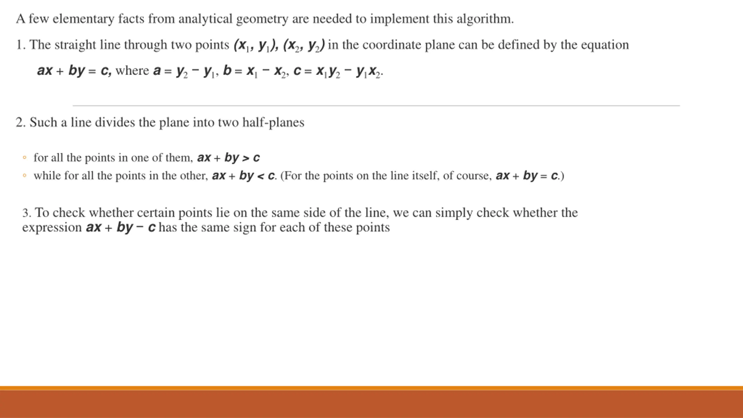 5. A few elementary facts from analytical geometry are needed to implement this algorithm. 1. The straight line through two points (x1, y1), (x2, y2) in the coordinate plane can be defined by the equation ax + by = c, where a = y2− y1, b = x1− x2, c = x1y2− y1x2. 2. Such a line divides the plane into two half-planes ◦ for all the points in one of them, ax + by > c ◦ while for all the points in the other, ax + by < c. (For the points on the line itself, of course, ax + by = c.) 3. To check whether certain points lie on the same side of the line, we can simply check whether the expression ax + by − c has the same sign for each of these points