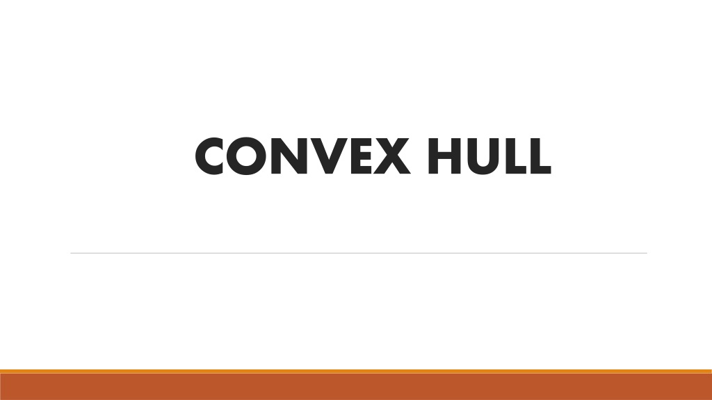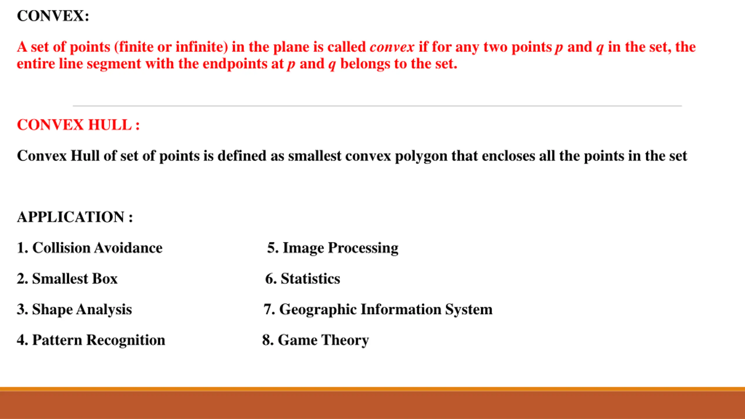 2. CONVEX: A set of points (finite or infinite) in the plane is called convex if for any two points p and q in the set, the entire line segment with the endpoints at p and q belongs to the set. CONVEX HULL : Convex Hull of set of points is defined as smallest convex polygon that encloses all the points in the set APPLICATION : 1. Collision Avoidance 5. Image Processing 2. Smallest Box 6. Statistics 3. Shape Analysis 7. Geographic Information System 4. Pattern Recognition 8. Game Theory