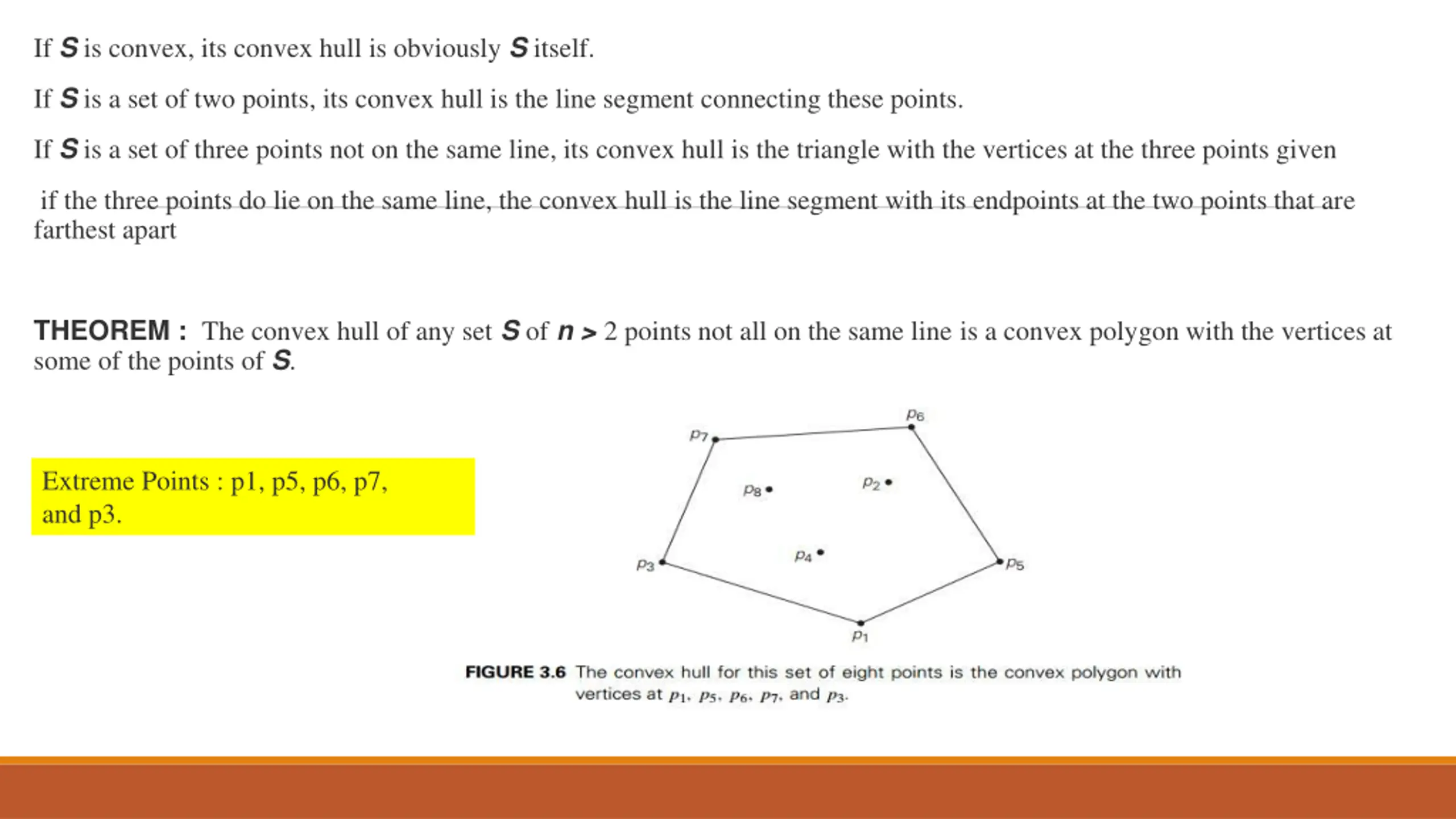 4. If S is convex, its convex hull is obviously S itself. If S is a set of two points, its convex hull is the line segment connecting these points. If S is a set of three points not on the same line, its convex hull is the triangle with the vertices at the three points given if the three points do lie on the same line, the convex hull is the line segment with its endpoints at the two points that are farthest apart THEOREM : The convex hull of any set S of n > 2 points not all on the same line is a convex polygon with the vertices at some of the points of S. Extreme Points : p1, p5, p6, p7, and p3.