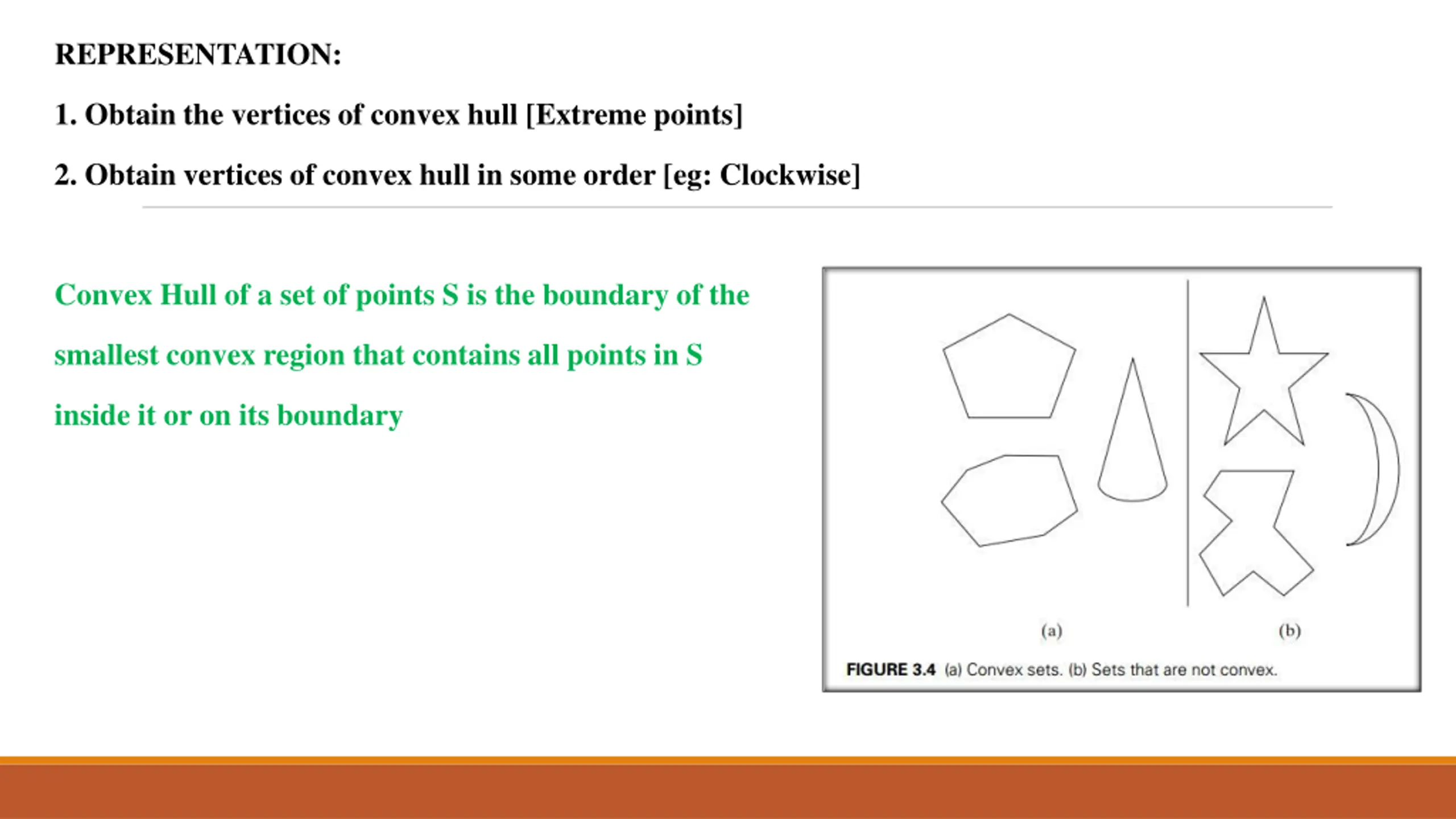 3. REPRESENTATION: 1. Obtain the vertices of convex hull [Extreme points] 2. Obtain vertices of convex hull in some order [eg: Clockwise] Convex Hull of a set of points S is the boundary of the smallest convex region that contains all points in S inside it or on its boundary