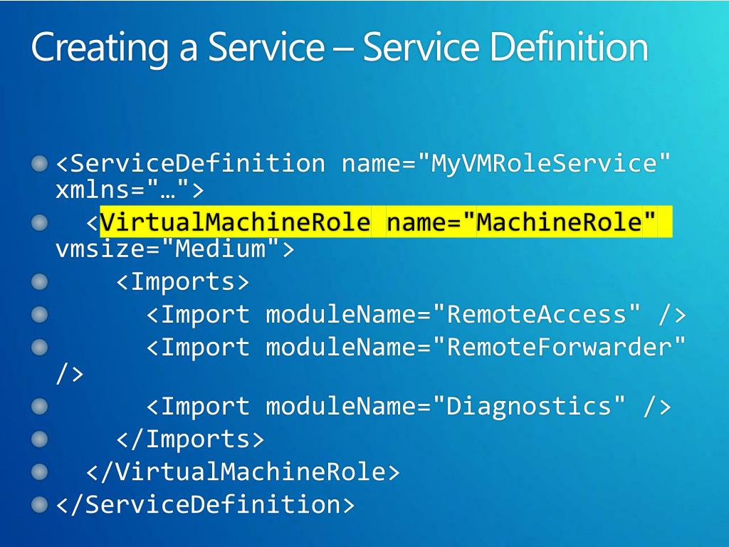 Creating a Service – Service Definition • <ServiceDefinition name="MyVMRoleService" xmlns="…"> • <VirtualMachineRolename="MachineRole"vmsize="Medium"> • <Imports> • <Import moduleName="RemoteAccess" /> • <Import moduleName="RemoteForwarder" /> • <Import moduleName="Diagnostics" /> • </Imports> • </VirtualMachineRole> • </ServiceDefinition>