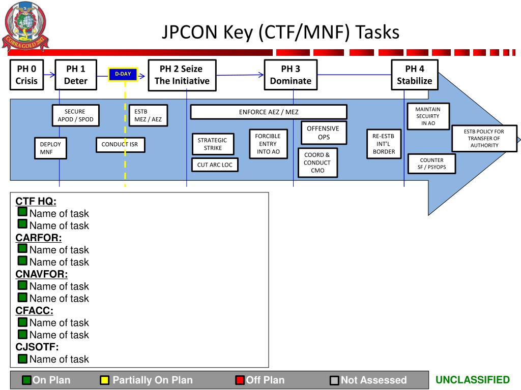 JPCON Key (CTF/MNF) Tasks PH 0 Crisis PH 1 Deter PH 2 Seize The Initiative PH 3 Dominate PH 4 Stabilize D-DAY MAINTAIN SECUIRTY IN AO SECURE APOD / SPOD ESTB MEZ / AEZ ENFORCE AEZ / MEZ OFFENSIVE OPS ESTB POLICY FOR TRANSFER OF AUTHORITY FORCIBLE ENTRY INTO AO RE-ESTB INT’L BORDER STRATEGIC STRIKE DEPLOY MNF CONDUCT ISR COORD & CONDUCT CMO COUNTER SF / PSYOPS CUT ARC LOC CTF HQ: Name of task Name of task CARFOR: Name of task Name of task CNAVFOR: Name of task Name of task CFACC: Name of task Name of task CJSOTF: Name of task On Plan Partially On Plan Off Plan Not Assessed