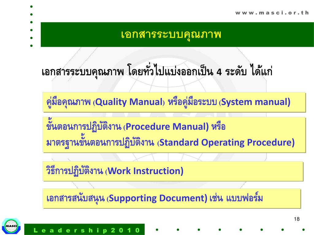 โครงสร้างของคู่มือระบบ (System Manual) • โครงสร้างองค์กร • ความรับผิดชอบของแต่ละส่วนงานที่เกี่ยวข้อง • ผังกระบวนการทำงานทั้งหมดขององค์กร • การอธิบายการจัดการแต่ละกระบวนการโดยย่อ (แต่ละกระบวนการจะไปเขียนเป็น SOP) • เชื่อมโยงไปยังคู่มือขั้นตอนการดำเนินงาน หรือเอกสารระดับอื่นๆ ขององค์กร