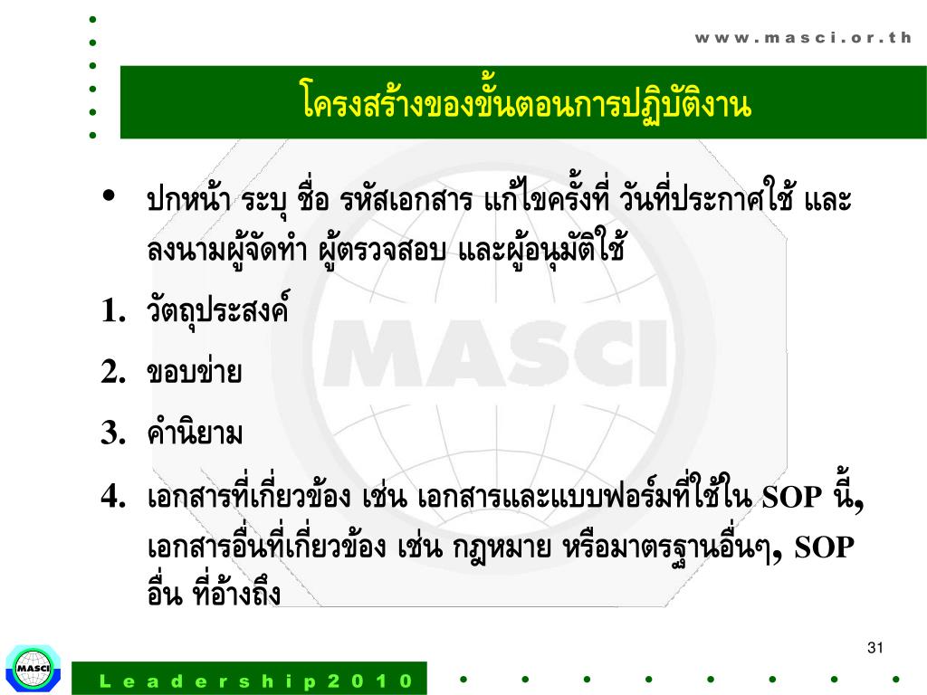 โครงสร้างของขั้นตอนการปฏิบัติงานโครงสร้างของขั้นตอนการปฏิบัติงาน • ปกหน้า ระบุ ชื่อ รหัสเอกสาร แก้ไขครั้งที่ วันที่ประกาศใช้ และลงนามผู้จัดทำ ผู้ตรวจสอบ และผู้อนุมัติใช้ • วัตถุประสงค์ • ขอบข่าย • คำนิยาม • เอกสารที่เกี่ยวข้อง เช่น เอกสารและแบบฟอร์มที่ใช้ใน SOPนี้, เอกสารอื่นที่เกี่ยวข้อง เช่น กฎหมาย หรือมาตรฐานอื่นๆ, SOPอื่น ที่อ้างถึง