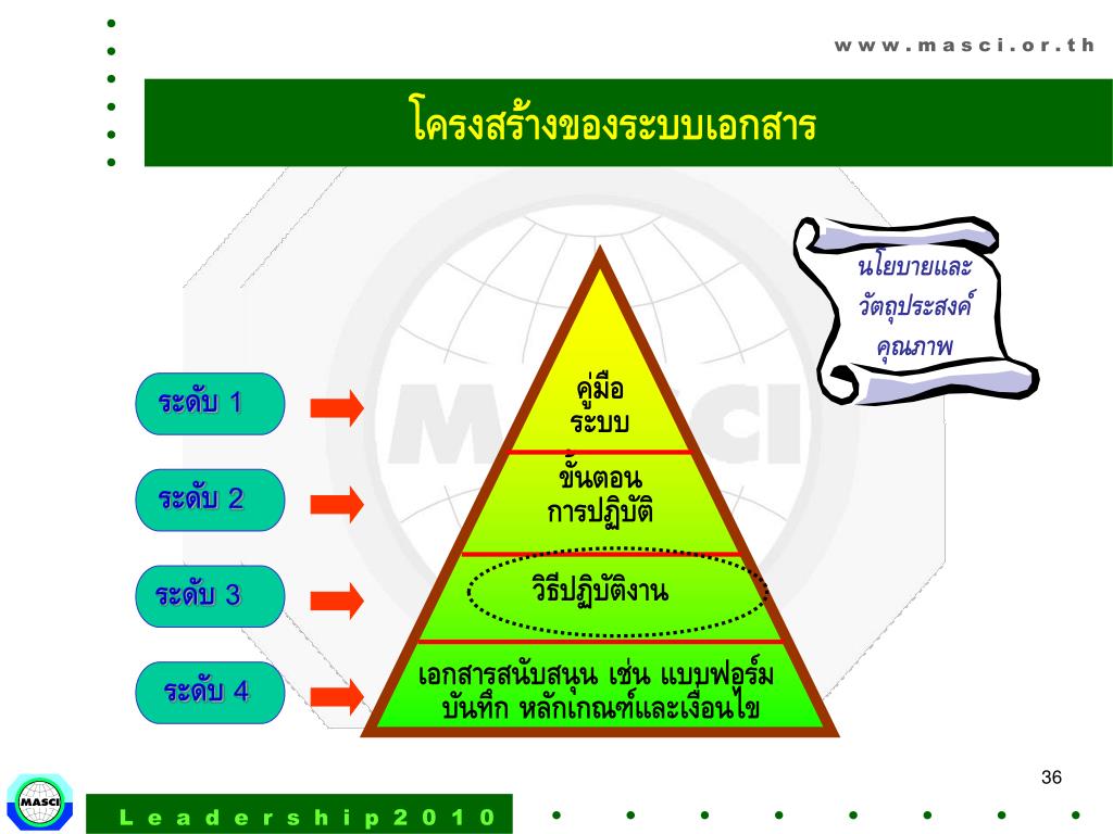 นโยบายและ วัตถุประสงค์ คุณภาพ ภาพรวมโครงสร้างระบบเอกสาร ระดับ 1 คู่มือ ระบบ ขั้นตอน การปฏิบัติ ระดับ2 ระดับ 3 วิธีปฏิบัติงาน เอกสารสนับสนุน เช่น แบบฟอร์ม บันทึก หลักเกณฑ์และเงื่อนไข ระดับ 4