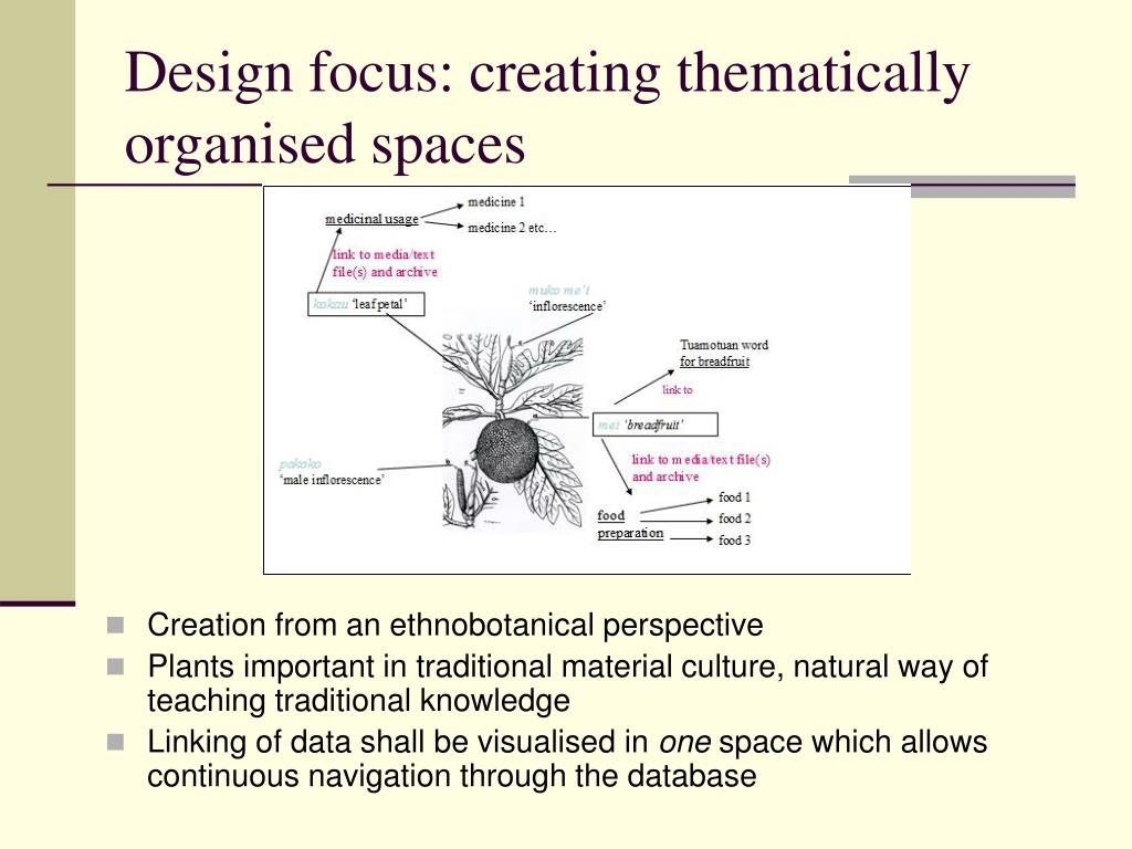 Design focus: creating thematically organised spaces • Creation from an ethnobotanical perspective • Plants important in traditional material culture, natural way of teaching traditional knowledge • Linking of data shall be visualised in one space which allows continuous navigation through the database