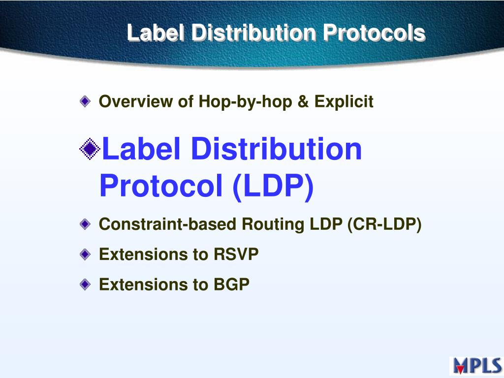 Label Distribution Protocols • Overview of Hop-by-hop & Explicit • Label Distribution Protocol (LDP) • Constraint-based Routing LDP (CR-LDP) • Extensions to RSVP • Extensions to BGP