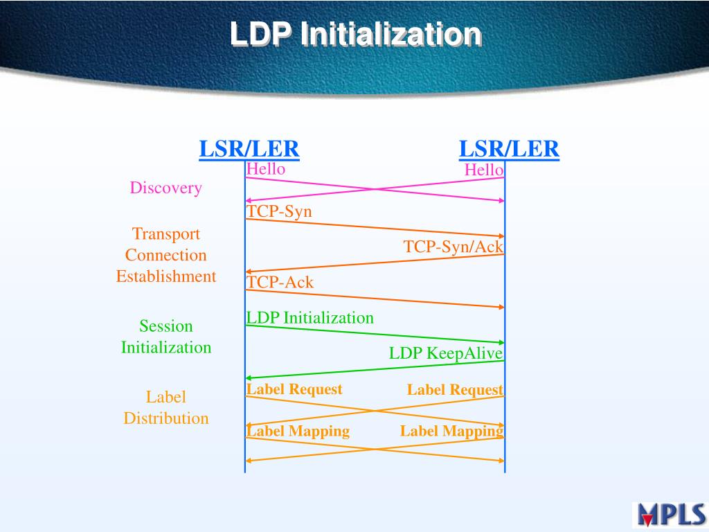 LDP Initialization LSR/LER LSR/LER Hello Hello Discovery TCP-Syn Transport Connection Establishment TCP-Syn/Ack TCP-Ack LDP Initialization Session Initialization LDP KeepAlive Label Request Label Request Label Distribution Label Mapping Label Mapping