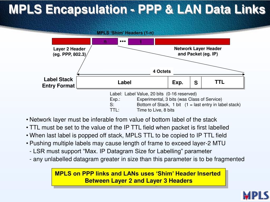 MPLS Encapsulation - PPP & LAN Data Links MPLS ‘Shim’ Headers (1-n) ••• n 1 Network Layer Header and Packet (eg. IP) Layer 2 Header (eg. PPP, 802.3) 4 Octets Label Stack Entry Format TTL Label Exp. S Label: Label Value, 20 bits (0-16 reserved) Exp.: Experimental, 3 bits (was Class of Service) S: Bottom of Stack, 1 bit (1 = last entry in label stack) TTL: Time to Live, 8 bits • Network layer must be inferable from value of bottom label of the stack • TTL must be set to the value of the IP TTL field when packet is first labelled • When last label is popped off stack, MPLS TTL to be copied to IP TTL field • Pushing multiple labels may cause length of frame to exceed layer-2 MTU • - LSR must support “Max. IP Datagram Size for Labelling” parameter • - any unlabelled datagram greater in size than this parameter is to be fragmented MPLS on PPP links and LANs uses ‘Shim’ Header Inserted Between Layer 2 and Layer 3 Headers