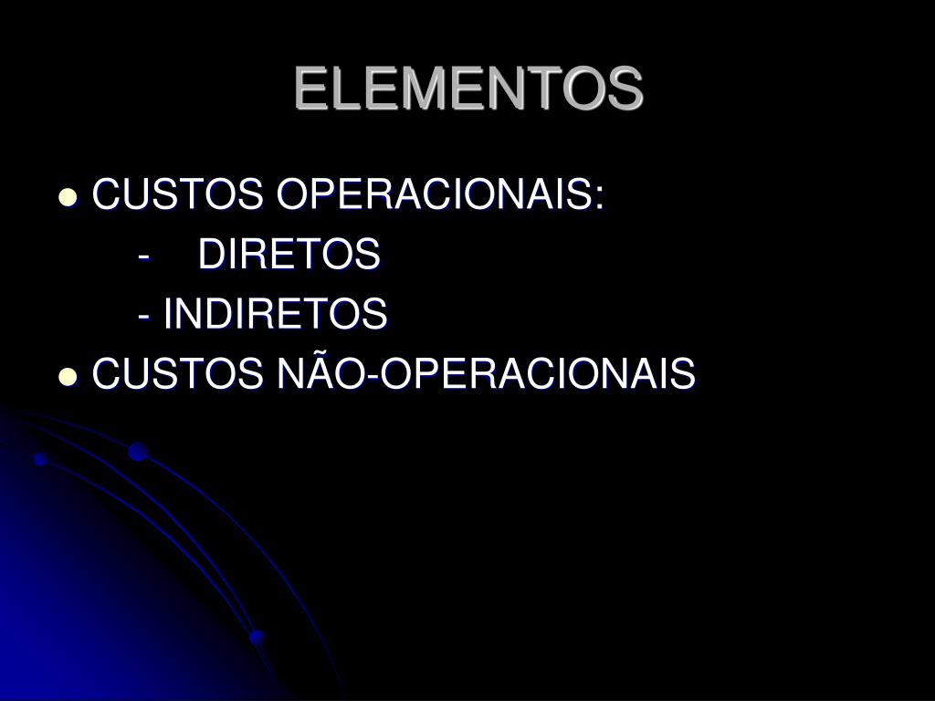 ELEMENTOS • CUSTOS OPERACIONAIS: - DIRETOS - INDIRETOS • CUSTOS NÃO-OPERACIONAIS