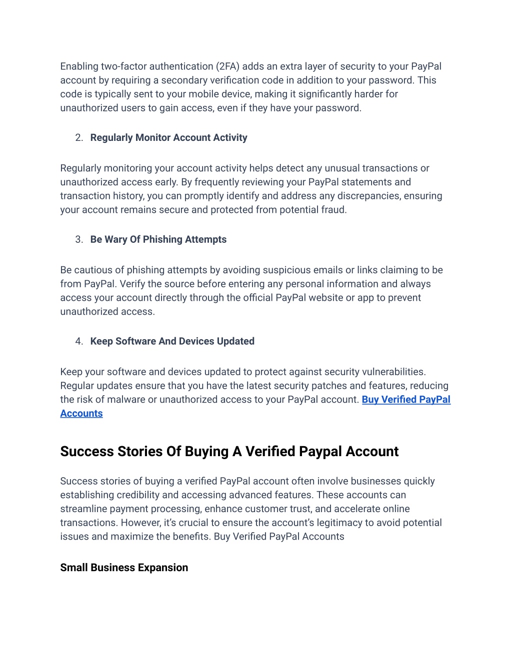 Enabling two-factor authentication (2FA) adds an extra layer of security to your PayPal account by requiring a secondary verification code in addition to your password. This code is typically sent to your mobile device, making it significantly harder for unauthorized users to gain access, even if they have your password. 2. Regularly Monitor Account Activity Regularly monitoring your account activity helps detect any unusual transactions or unauthorized access early. By frequently reviewing your PayPal statements and transaction history, you can promptly identify and address any discrepancies, ensuring your account remains secure and protected from potential fraud. 3. Be Wary Of Phishing Attempts Be cautious of phishing attempts by avoiding suspicious emails or links claiming to be from PayPal. Verify the source before entering any personal information and always access your account directly through the official PayPal website or app to prevent unauthorized access. 4. Keep Software And Devices Updated Keep your software and devices updated to protect against security vulnerabilities. Regular updates ensure that you have the latest security patches and features, reducing the risk of malware or unauthorized access to your PayPal account. Buy Verified PayPal Accounts Success Stories Of Buying A Verified Paypal Account Success stories of buying a verified PayPal account often involve businesses quickly establishing credibility and accessing advanced features. These accounts can streamline payment processing, enhance customer trust, and accelerate online transactions. However, it’s crucial to ensure the account’s legitimacy to avoid potential issues and maximize the benefits. Buy Verified PayPal Accounts Small Business Expansion