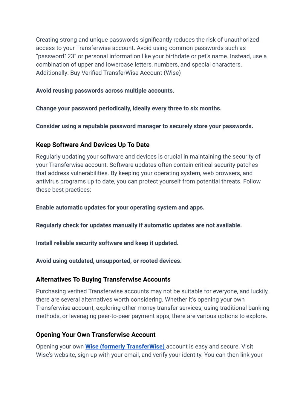 Creating strong and unique passwords significantly reduces the risk of unauthorized access to your Transferwise account. Avoid using common passwords such as “password123” or personal information like your birthdate or pet’s name. Instead, use a combination of upper and lowercase letters, numbers, and special characters. Additionally: Buy Verified TransferWise Account (Wise) Avoid reusing passwords across multiple accounts. Change your password periodically, ideally every three to six months. Consider using a reputable password manager to securely store your passwords. Keep Software And Devices Up To Date Regularly updating your software and devices is crucial in maintaining the security of your Transferwise account. Software updates often contain critical security patches that address vulnerabilities. By keeping your operating system, web browsers, and antivirus programs up to date, you can protect yourself from potential threats. Follow these best practices: Enable automatic updates for your operating system and apps. Regularly check for updates manually if automatic updates are not available. Install reliable security software and keep it updated. Avoid using outdated, unsupported, or rooted devices. Alternatives To Buying Transferwise Accounts Purchasing verified Transferwise accounts may not be suitable for everyone, and luckily, there are several alternatives worth considering. Whether it’s opening your own Transferwise account, exploring other money transfer services, using traditional banking methods, or leveraging peer-to-peer payment apps, there are various options to explore. Opening Your Own Transferwise Account Opening your own Wise (formerly TransferWise) account is easy and secure. Visit Wise’s website, sign up with your email, and verify your identity. You can then link your