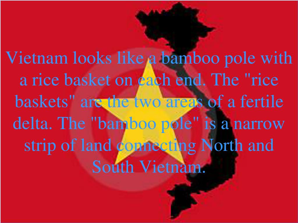 Vietnam looks like a bamboo pole with a rice basket on each end. The "rice baskets" are the two areas of a fertile delta. The "bamboo pole" is a narrow strip of land connecting North and South Vietnam.