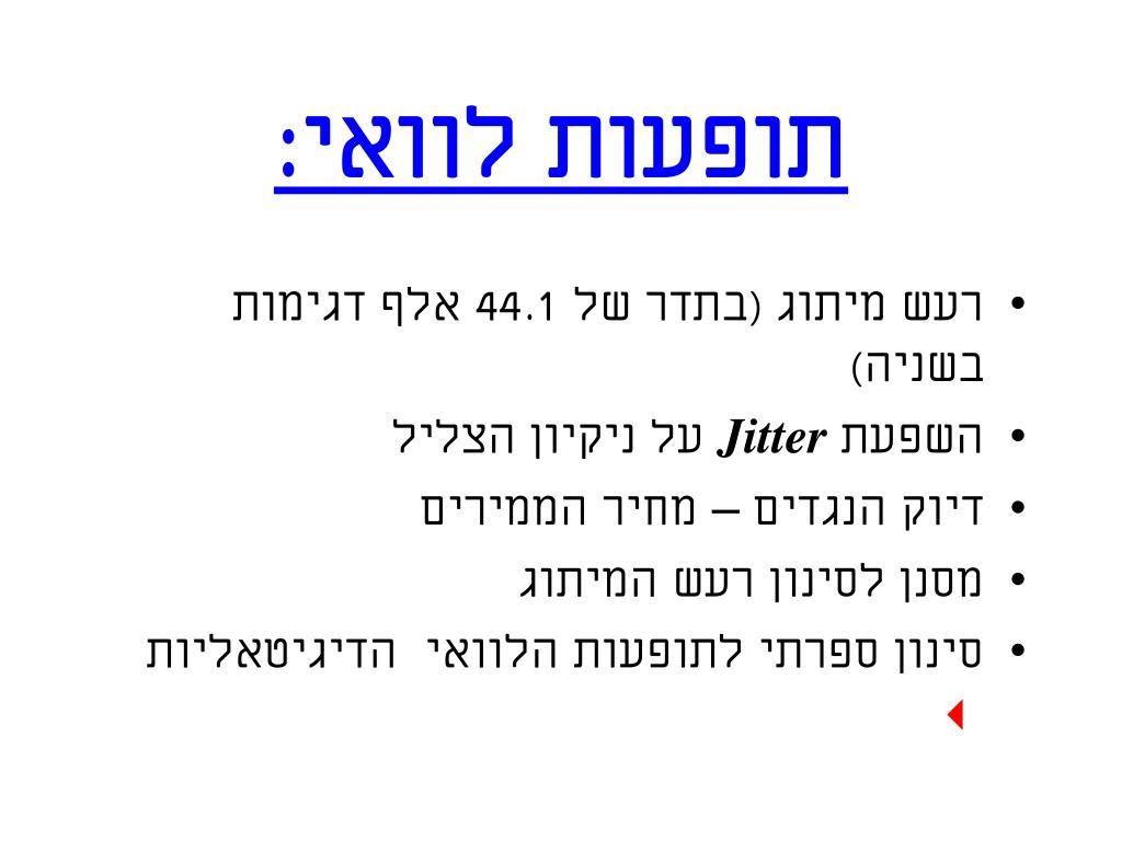 סוגי ה-Jitter • Jitter שנובע מהמקור (השעון של הטרנספורט) • Jitter שנובע מקו התמסורת: קו אופטי - 5ננושניה קוקואקס - 10 ננו שניה • Jitter של מעגל הכניסה לממיר/פרוססור. • Jitter שנובע מקו הרשת (ספקי כוח) • Jitter בדגימת המידע בממיר