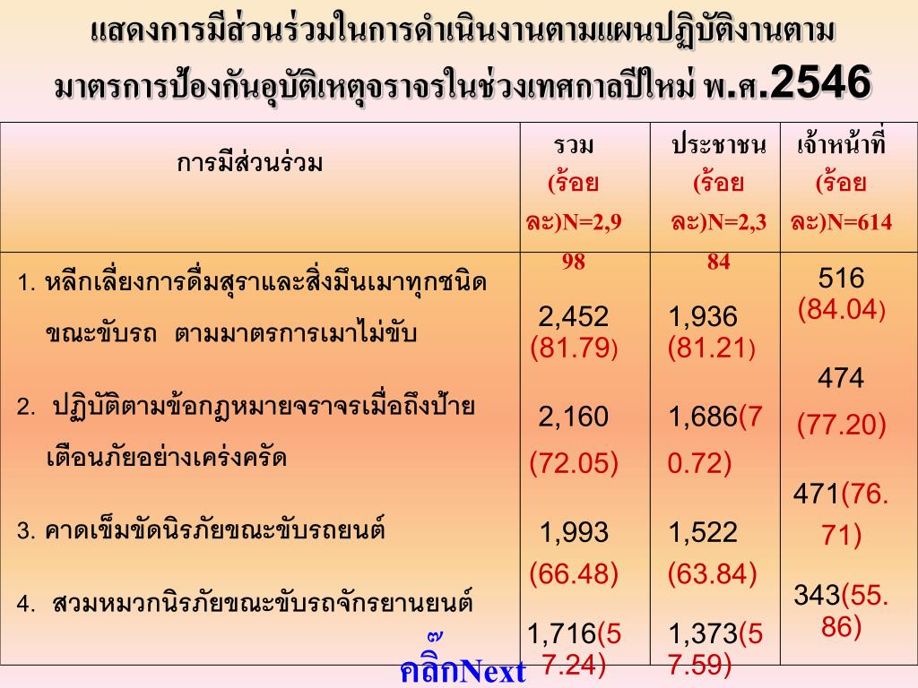 แสดงการมีส่วนร่วมในการดำเนินงานตามแผนปฏิบัติงานตามมาตรการป้องกันอุบัติเหตุจราจรในช่วงเทศกาลปีใหม่ พ.ศ.2546 รวม (ร้อยละ)N=2,998 2,452 (81.79) 2,160 (72.05) 1,993 (66.48) 1,716(57.24) ประชาชน (ร้อยละ)N=2,384 1,936 (81.21) 1,686(70.72) 1,522 (63.84) 1,373(57.59) เจ้าหน้าที่ (ร้อยละ)N=614 516 (84.04) 474 (77.20) 471(76.71) 343(55.86) การมีส่วนร่วม 1. หลีกเลี่ยงการดื่มสุราและสิ่งมึนเมาทุกชนิดขณะขับรถ ตามมาตรการเมาไม่ขับ 2. ปฏิบัติตามข้อกฎหมายจราจรเมื่อถึงป้ายเตือนภัยอย่างเคร่งครัด 3. คาดเข็มขัดนิรภัยขณะขับรถยนต์ 4. สวมหมวกนิรภัยขณะขับรถจักรยานยนต์ คลิ๊กNext