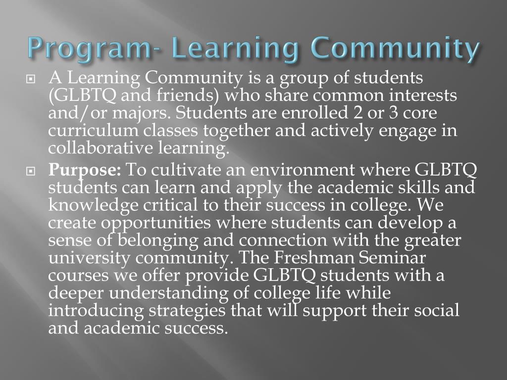 Program- Learning Community • ALearning Community is a group of students (GLBTQ and friends) who share common interests and/or majors. Students are enrolled 2 or 3 core curriculum classes together and actively engage in collaborative learning. • Purpose: To cultivate an environment where GLBTQ students can learn and apply the academic skills and knowledge critical to their success in college. We create opportunities where students can develop a sense of belonging and connection with the greater university community. The Freshman Seminar courses we offer provide GLBTQ students with a deeper understanding of college life while introducing strategies that will support their social and academic success.