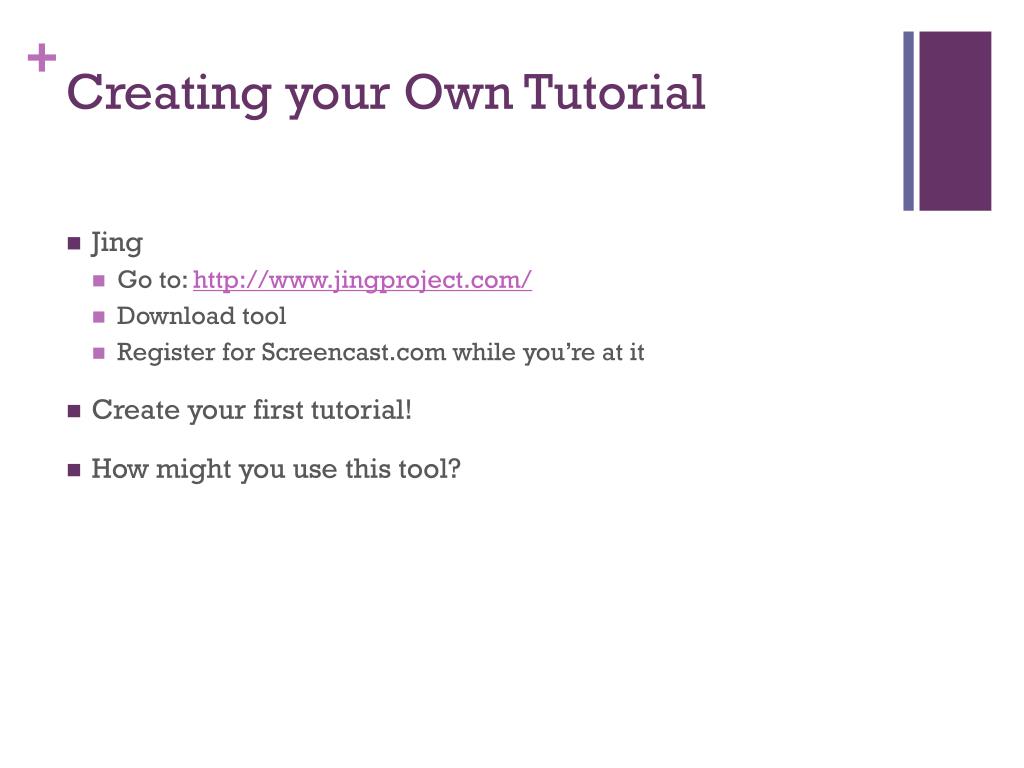 Creating your Own Tutorial • Jing • Go to: http://www.jingproject.com/ • Download tool • Register for Screencast.com while you’re at it • Create your first tutorial! • How might you use this tool?