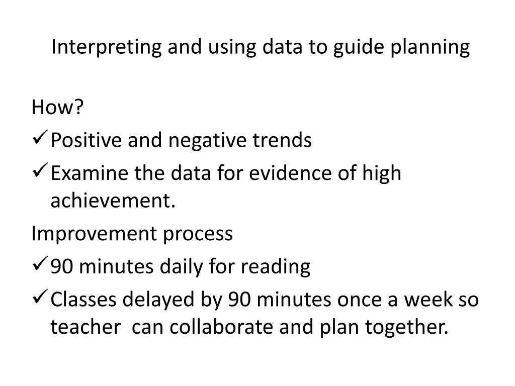 Interpreting and using data to guide planning How? • Positive and negative trends • Examine the data for evidence of high achievement. Improvement process • 90 minutes daily for reading • Classes delayed by 90 minutes once a week so teacher can collaborate and plan together.