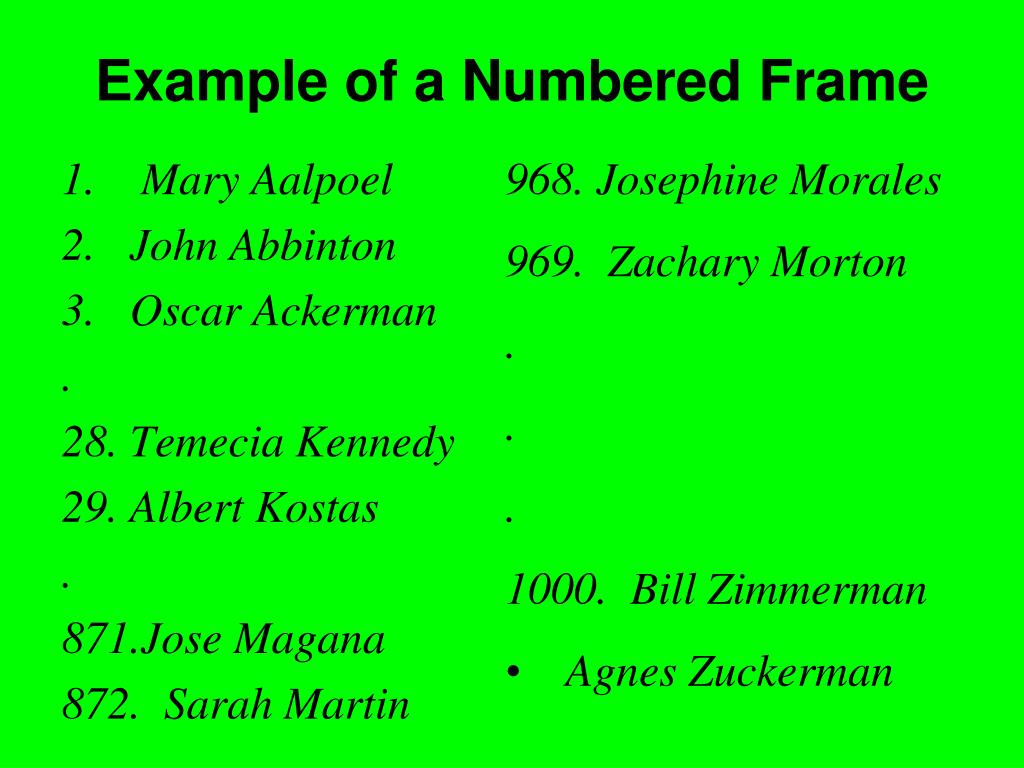 Example of a Numbered Frame • Josephine Morales • Zachary Morton • . • . • . • 1000. Bill Zimmerman • Agnes Zuckerman 1. Mary Aalpoel • John Abbinton • Oscar Ackerman . • Temecia Kennedy • Albert Kostas . • Jose Magana • Sarah Martin
