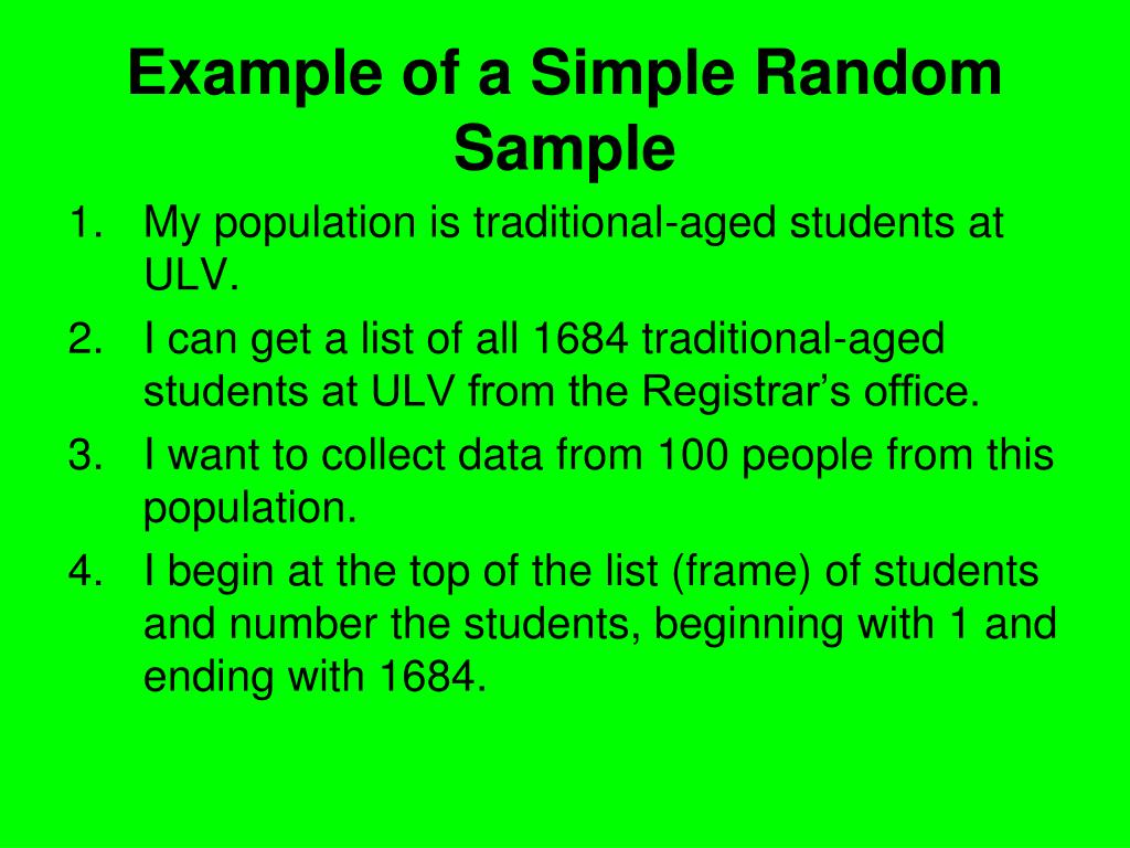 Example of a Simple Random Sample • My population is traditional-aged students at ULV. • I can get a list of all 1684 traditional-aged students at ULV from the Registrar’s office. • I want to collect data from 100 people from this population. • I begin at the top of the list (frame) of students and number the students, beginning with 1 and ending with 1684.