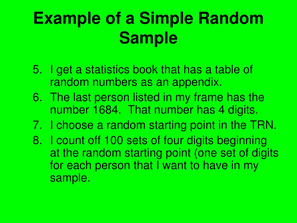 Example of a Simple Random Sample • I get a statistics book that has a table of random numbers as an appendix. • The last person listed in my frame has the number 1684. That number has 4 digits. • I choose a random starting point in the TRN. • I count off 100 sets of four digits beginning at the random starting point (one set of digits for each person that I want to have in my sample.