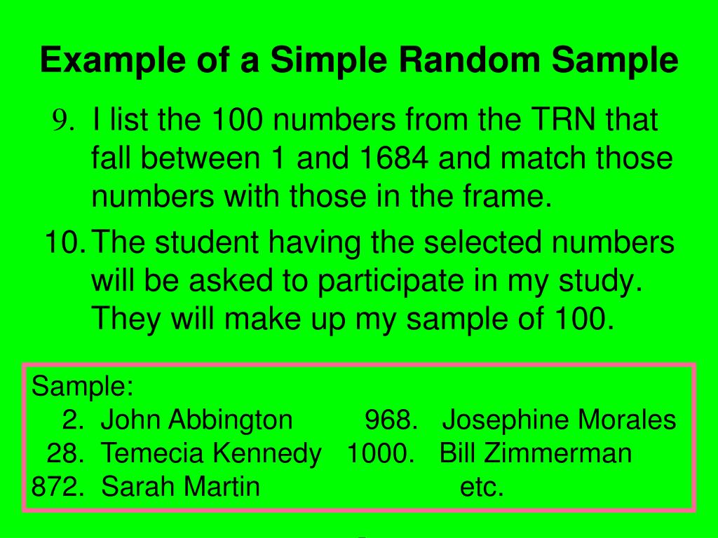Example of a Simple Random Sample 9. I list the 100 numbers from the TRN that fall between 1 and 1684 and match those numbers with those in the frame. • The student having the selected numbers will be asked to participate in my study. They will make up my sample of 100. Sample: 2. John Abbington 968. Josephine Morales 28. Temecia Kennedy 1000. Bill Zimmerman 872. Sarah Martin etc.