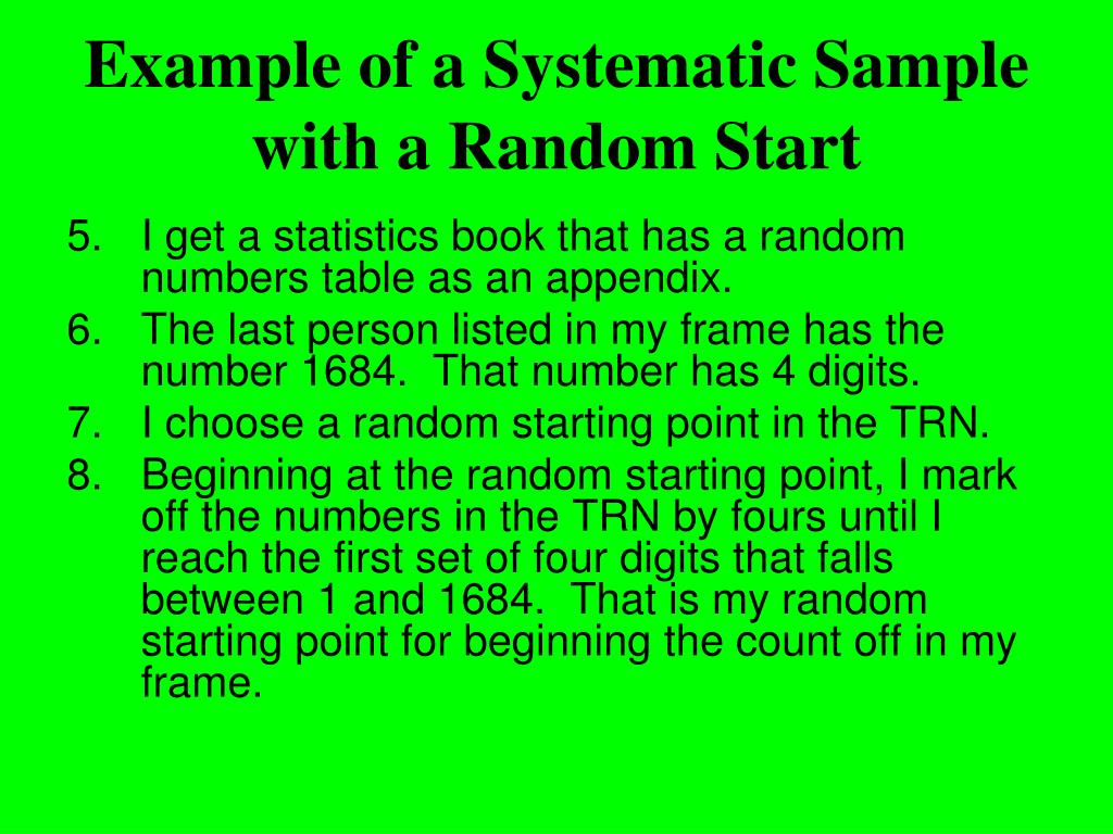 Example of a Systematic Sample with a Random Start • I get a statistics book that has a random numbers table as an appendix. • The last person listed in my frame has the number 1684. That number has 4 digits. • I choose a random starting point in the TRN. • Beginning at the random starting point, I mark off the numbers in the TRN by fours until I reach the first set of four digits that falls between 1 and 1684. That is my random starting point for beginning the count off in my frame.