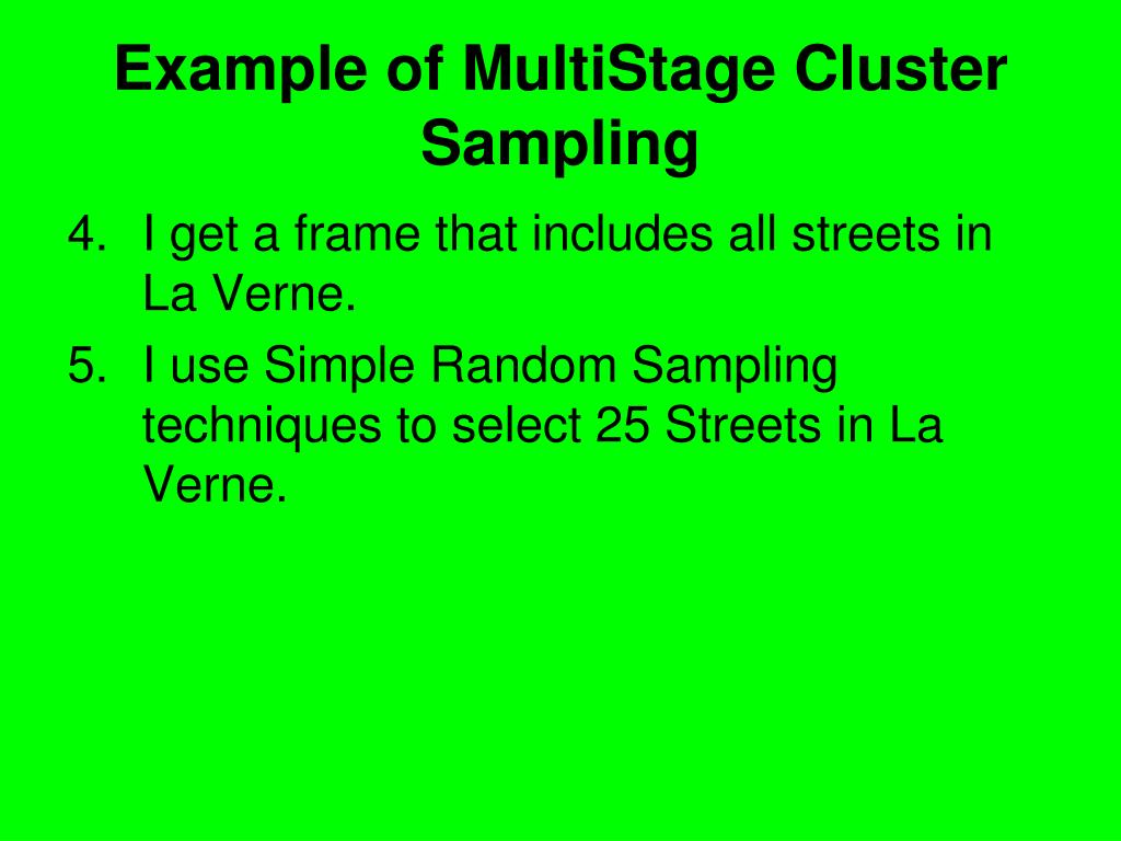 Example of MultiStage Cluster Sampling • I get a frame that includes all streets in La Verne. • I use Simple Random Sampling techniques to select 25 Streets in La Verne.