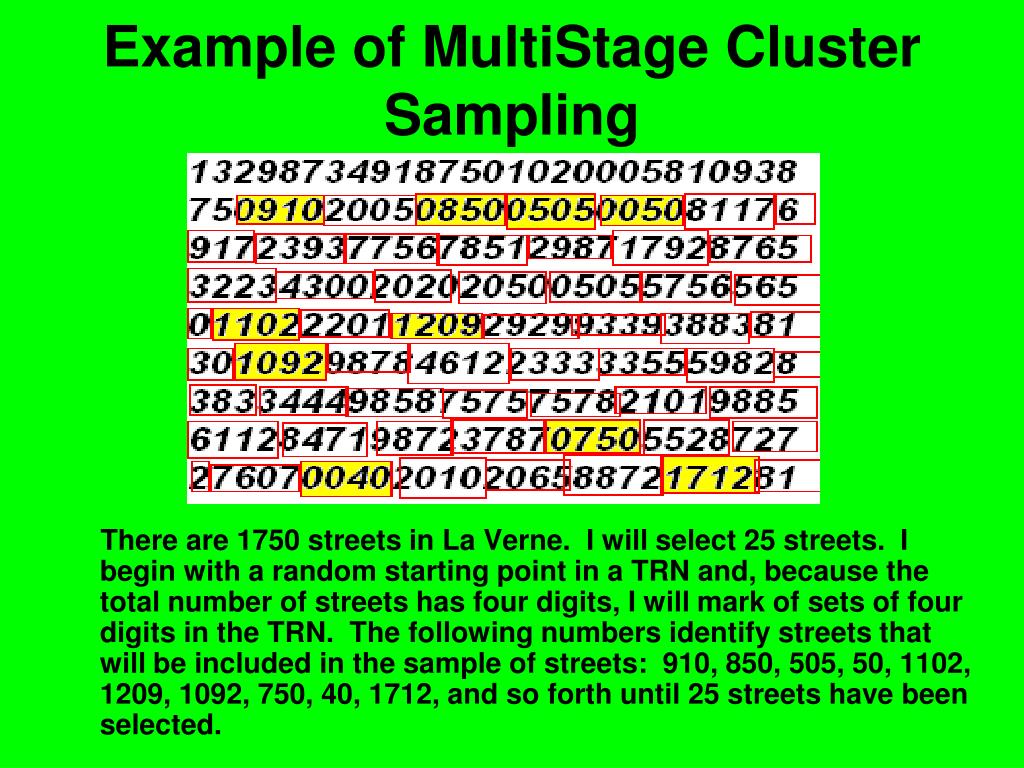 Example of MultiStage Cluster Sampling There are 1750 streets in La Verne. I will select 25 streets. I begin with a random starting point in a TRN and, because the total number of streets has four digits, I will mark of sets of four digits in the TRN. The following numbers identify streets that will be included in the sample of streets: 910, 850, 505, 50, 1102, 1209, 1092, 750, 40, 1712, and so forth until 25 streets have been selected.