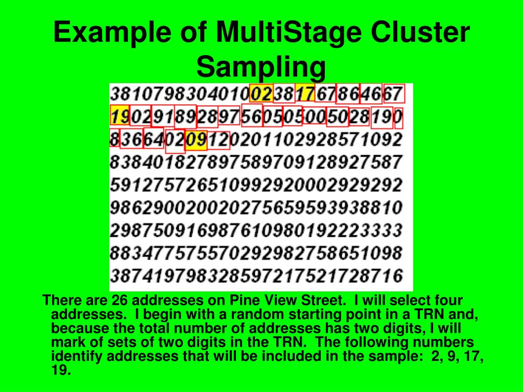 Example of MultiStage Cluster Sampling There are 26 addresses on Pine View Street. I will select four addresses. I begin with a random starting point in a TRN and, because the total number of addresses has two digits, I will mark of sets of two digits in the TRN. The following numbers identify addresses that will be included in the sample: 2, 9, 17, 19.