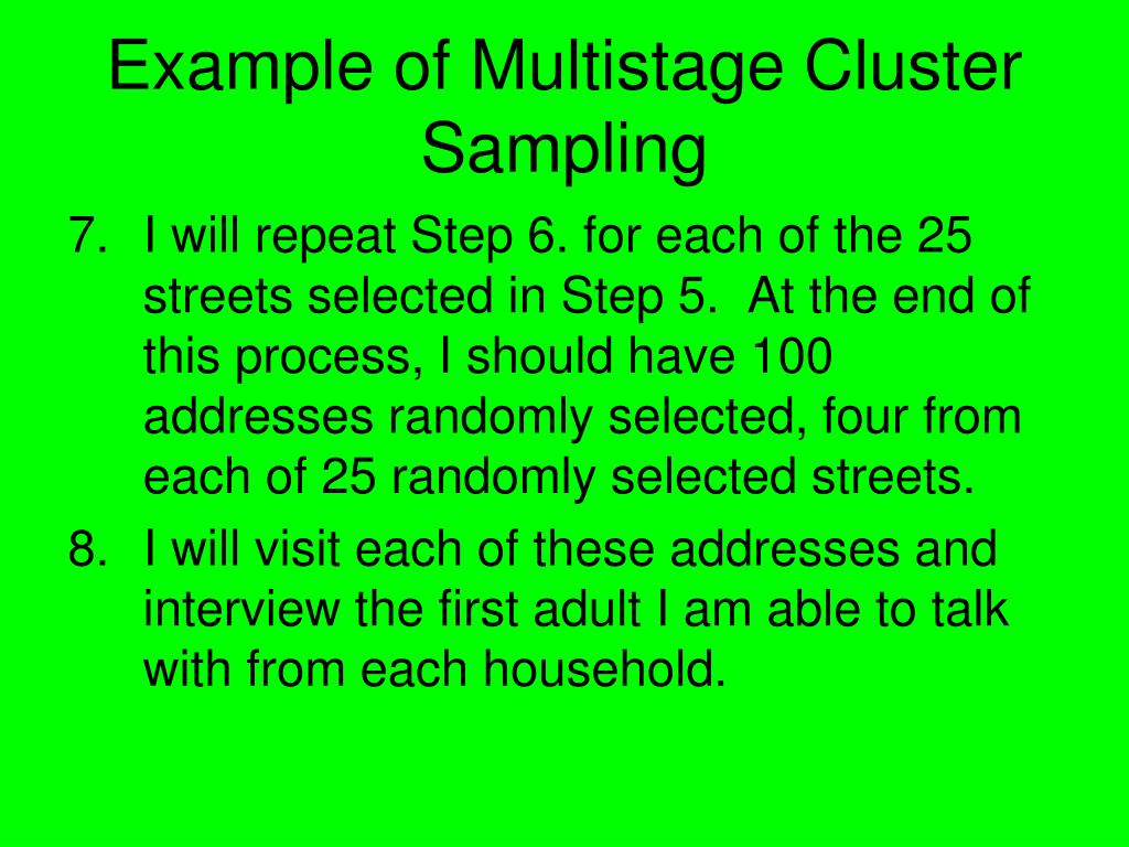 Example of Multistage Cluster Sampling • I will repeat Step 6. for each of the 25 streets selected in Step 5. At the end of this process, I should have 100 addresses randomly selected, four from each of 25 randomly selected streets. • I will visit each of these addresses and interview the first adult I am able to talk with from each household.