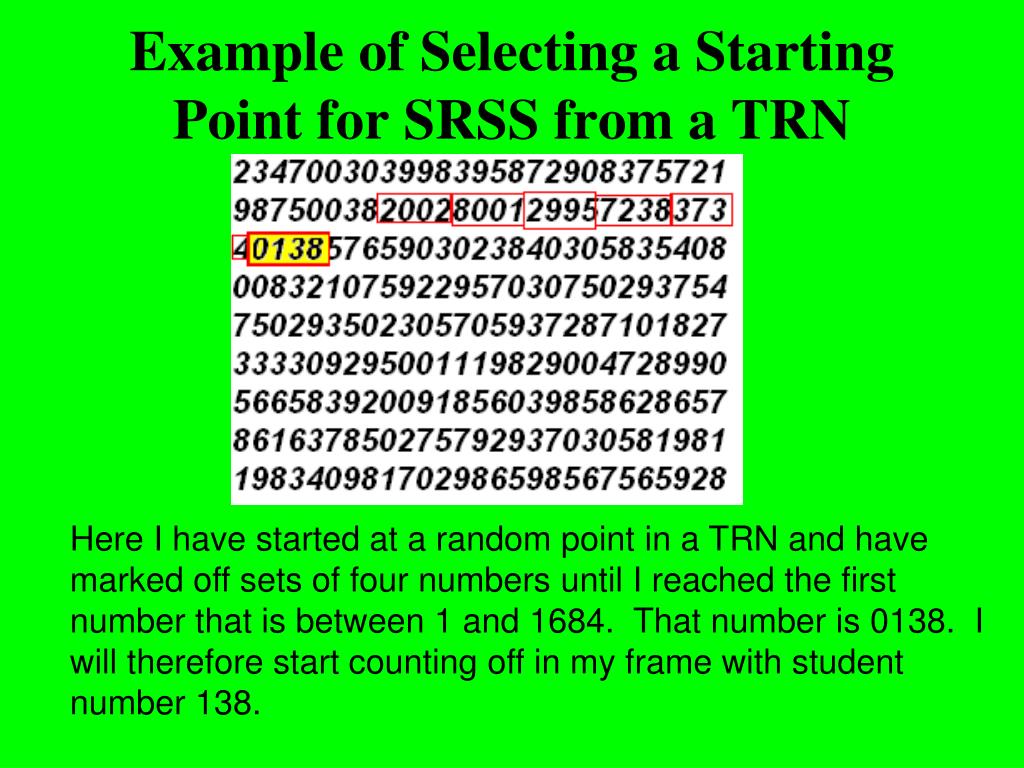 Example of Selecting a Starting Point for SRSS from a TRN Here I have started at a random point in a TRN and have marked off sets of four numbers until I reached the first number that is between 1 and 1684. That number is 0138. I will therefore start counting off in my frame with student number 138.