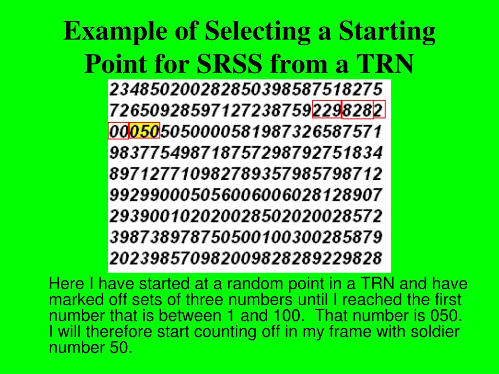 Example of Selecting a Starting Point for SRSS from a TRN Here I have started at a random point in a TRN and have marked off sets of three numbers until I reached the first number that is between 1 and 100. That number is 050. I will therefore start counting off in my frame with soldier number 50.