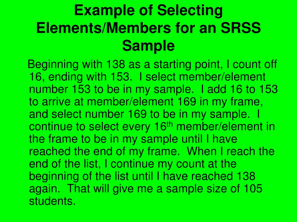 Example of Selecting Elements/Members for an SRSS Sample Beginning with 138 as a starting point, I count off 16, ending with 153. I select member/element number 153 to be in my sample. I add 16 to 153 to arrive at member/element 169 in my frame, and select number 169 to be in my sample. I continue to select every 16th member/element in the frame to be in my sample until I have reached the end of my frame. When I reach the end of the list, I continue my count at the beginning of the list until I have reached 138 again. That will give me a sample size of 105 students.