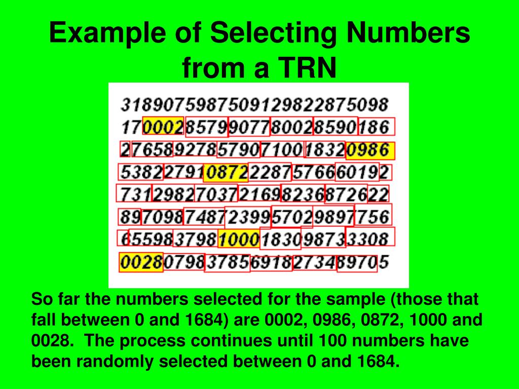 Example of Selecting Numbersfrom a TRN So far the numbers selected for the sample (those that fall between 0 and 1684) are 0002, 0986, 0872, 1000 and 0028. The process continues until 100 numbers have been randomly selected between 0 and 1684.