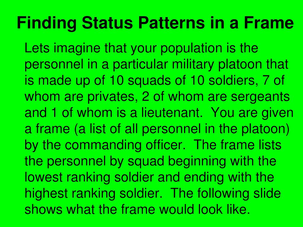 Finding Status Patterns in a Frame Lets imagine that your population is the personnel in a particular military platoon that is made up of 10 squads of 10 soldiers, 7 of whom are privates, 2 of whom are sergeants and 1 of whom is a lieutenant. You are given a frame (a list of all personnel in the platoon) by the commanding officer. The frame lists the personnel by squad beginning with the lowest ranking soldier and ending with the highest ranking soldier. The following slide shows what the frame would look like.