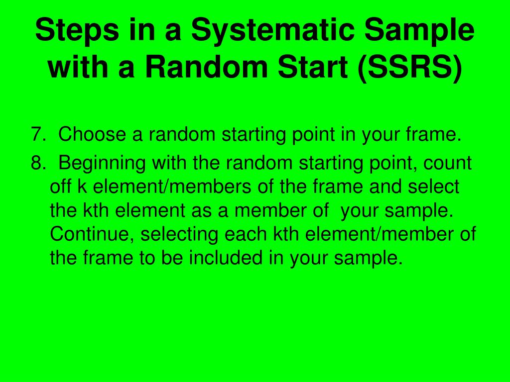 Steps in a Systematic Sample with a Random Start (SSRS) 7. Choose a random starting point in your frame. 8. Beginning with the random starting point, count off k element/members of the frame and select the kth element as a member of your sample. Continue, selecting each kth element/member of the frame to be included in your sample.