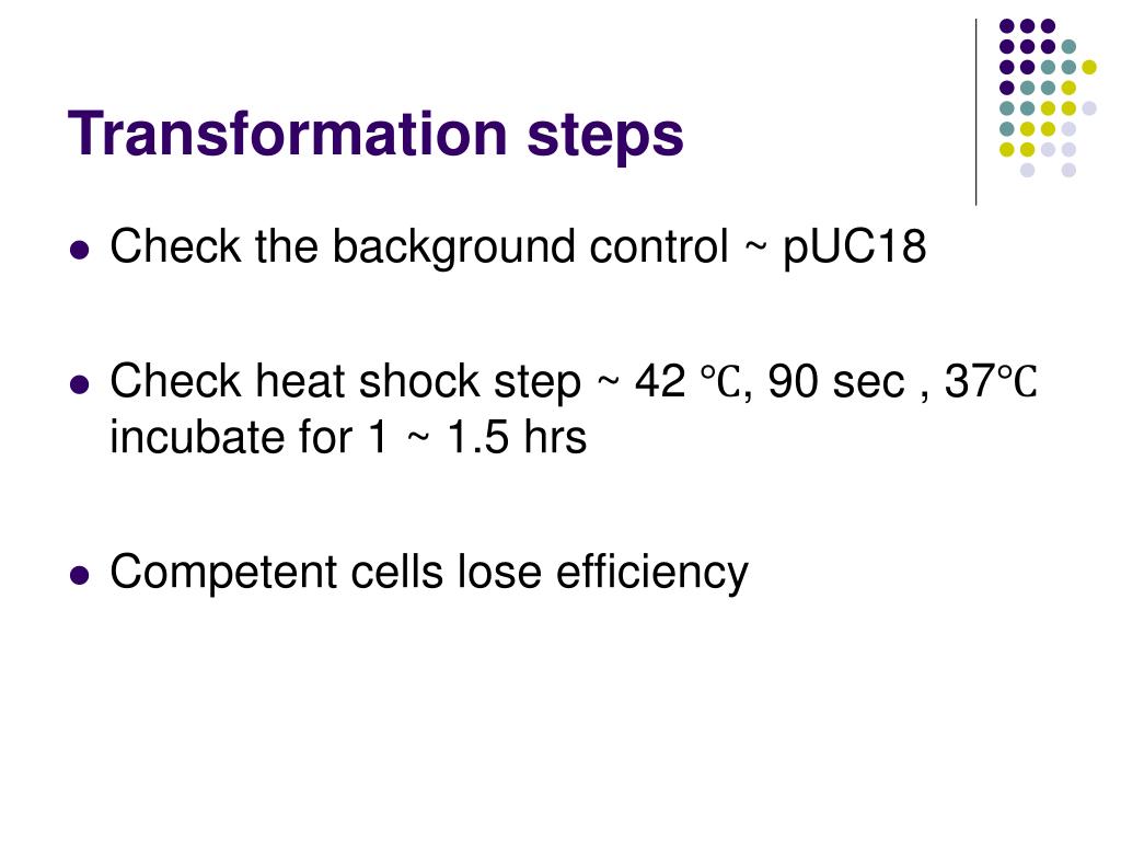 Transformation steps • Check the background control ~ pUC18 • Check heat shock step ~ 42 ℃, 90 sec , 37℃ incubate for 1 ~ 1.5 hrs • Competent cells lose efficiency