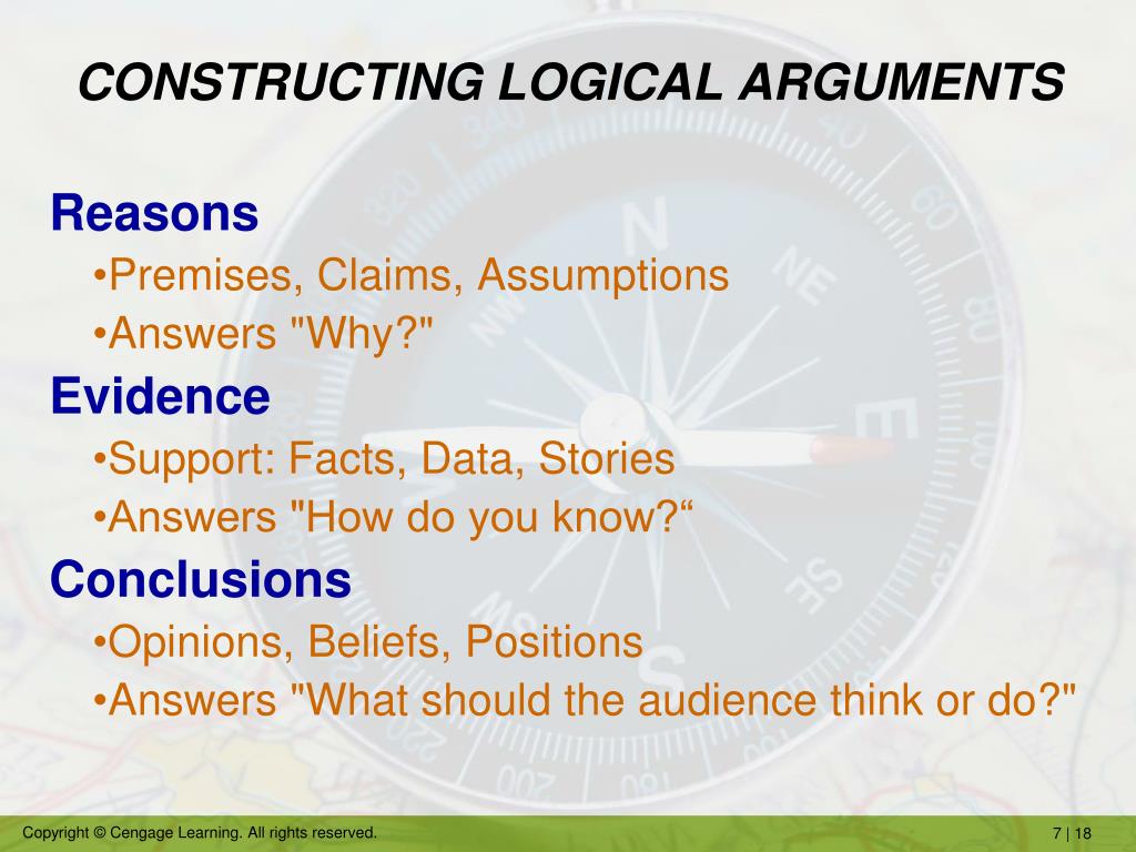 CONSTRUCTING LOGICAL ARGUMENTS Reasons Premises, Claims, Assumptions Answers "Why?" Evidence Support: Facts, Data, Stories Answers "How do you know?“ Conclusions Opinions, Beliefs, Positions Answers "What should the audience think or do?"