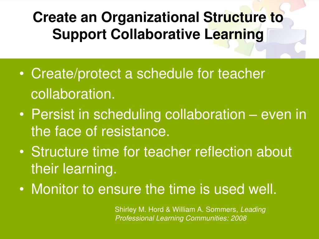 Create an Organizational Structure to Support Collaborative Learning • Create/protect a schedule for teacher collaboration. • Persist in scheduling collaboration – even in the face of resistance. • Structure time for teacher reflection about their learning. • Monitor to ensure the time is used well. Shirley M. Hord & William A. Sommers, Leading Professional Learning Communities: 2008